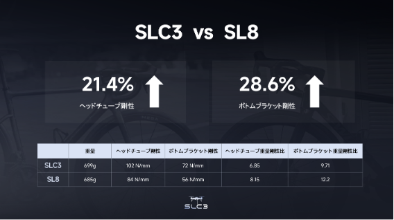 前モデルSLC2に対して、ヘッド部分で31.8%、ボトムブラケット部分で21.6%の剛性向上を実現。社内テストにおいてはS-WORKS TARMAC SL8以上の重量剛性比を叩き出した。